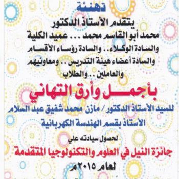 The faculty of engineering would like to congratulate Professor/ mazen Abd El-Salam for winning the Nile Award in Science and Advanced Technology, wishing him all the best
