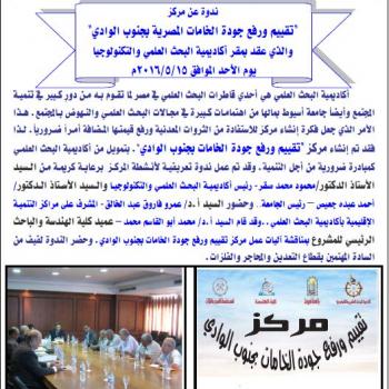 The Academy of Scientific Research and Technology (ASRT) will hold a symposium about "Evaluating and Improving The Quality of Egyptian Raw Materials in South Valley" Centre on Sunday 15-5-2016.