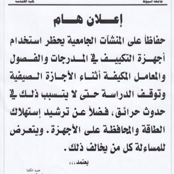 Assiut University decided that air conditioners will not be used in amphitheatres, classes or laboratories during summer holidays to reduce energy consumption and avoid fires. Anyone who violates…
