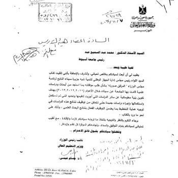The head of the national agency of sinai peninsula asked the head of assiut university to send him the scientific researches and studies that the university did in the latest  three years (2011-…