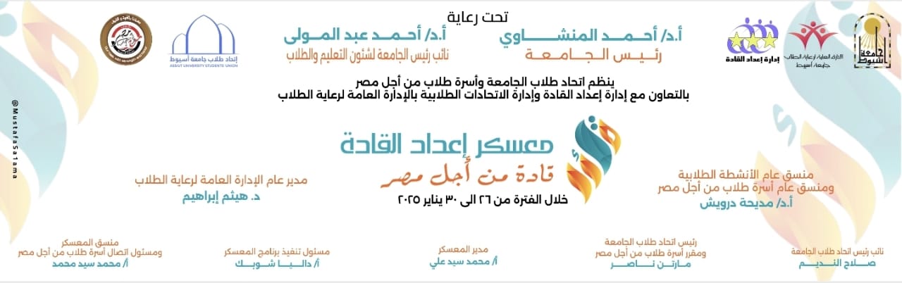 Prof. El-Minshawy, president of Assiut University, will open tomorrow, Monday, January, the activities of the leaders preparation camp, under the slogan "Leaders, leadership; for Egypt", under the supervision of Dr. Ahmed Abdel-Mawla, vice president of the University for education and Student Affairs, and Dr. Madiha Darwish, general supervisor of student activities, and general coordinator of the students 'family for Egypt, which is held in cooperation between the students' family for Egypt, the University Students ' Union, the Department of leaders preparation and care of the Distinguished, at the General Administration of student welfare, in the eight Hall of the administrative building, which continues during the period from 26 next January until 30 from january.