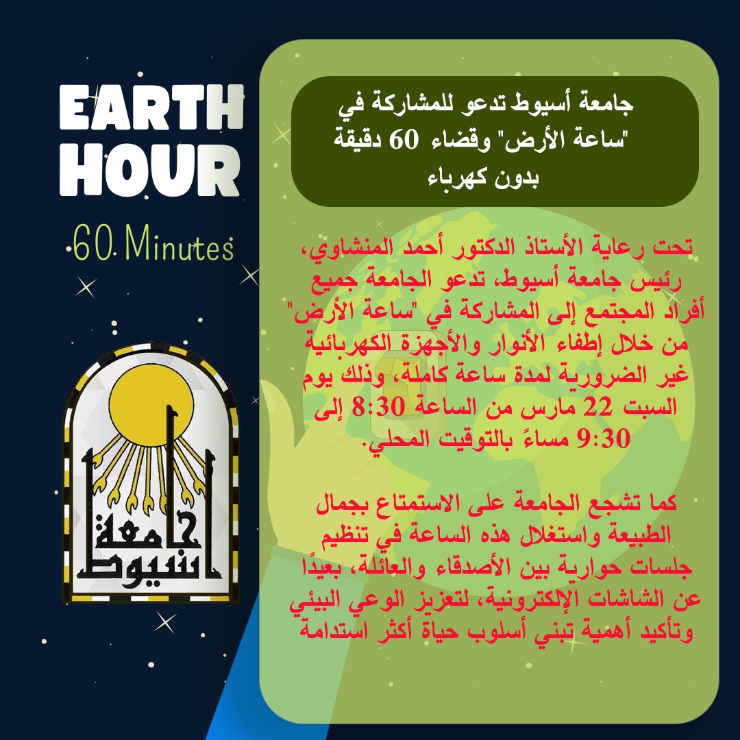 Under the supervision of Professor Dr. Ahmed El-Minshawy, president of Assiut University, Assiut University invites all members of the community to participate in the "Earth Hour" this Saturday evening, March 22, from 8:30 to 9:30 pm, by turning off lights and unnecessary electrical appliances for a full hour. In order to promote environmental awareness and encourage a more sustainable lifestyle