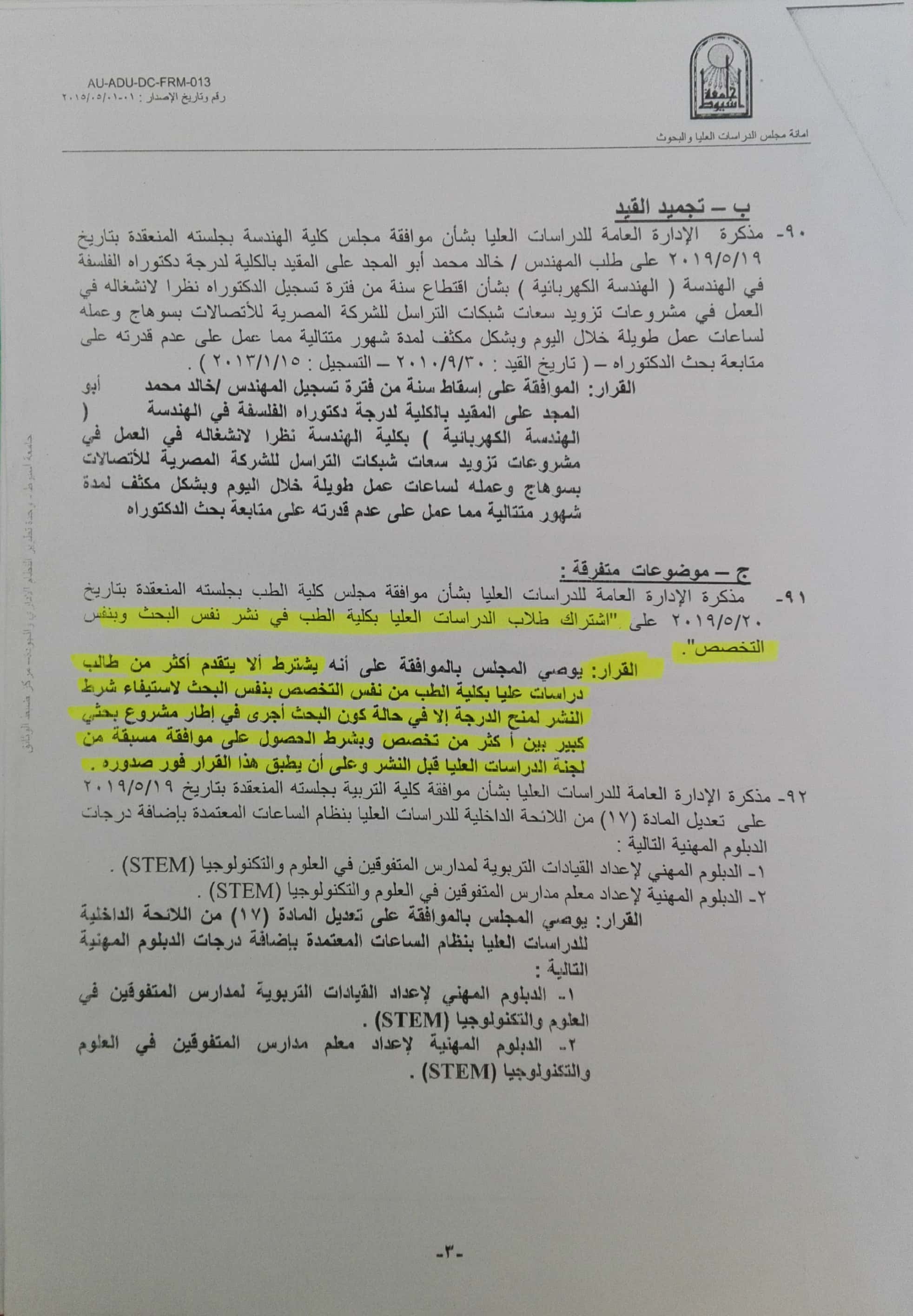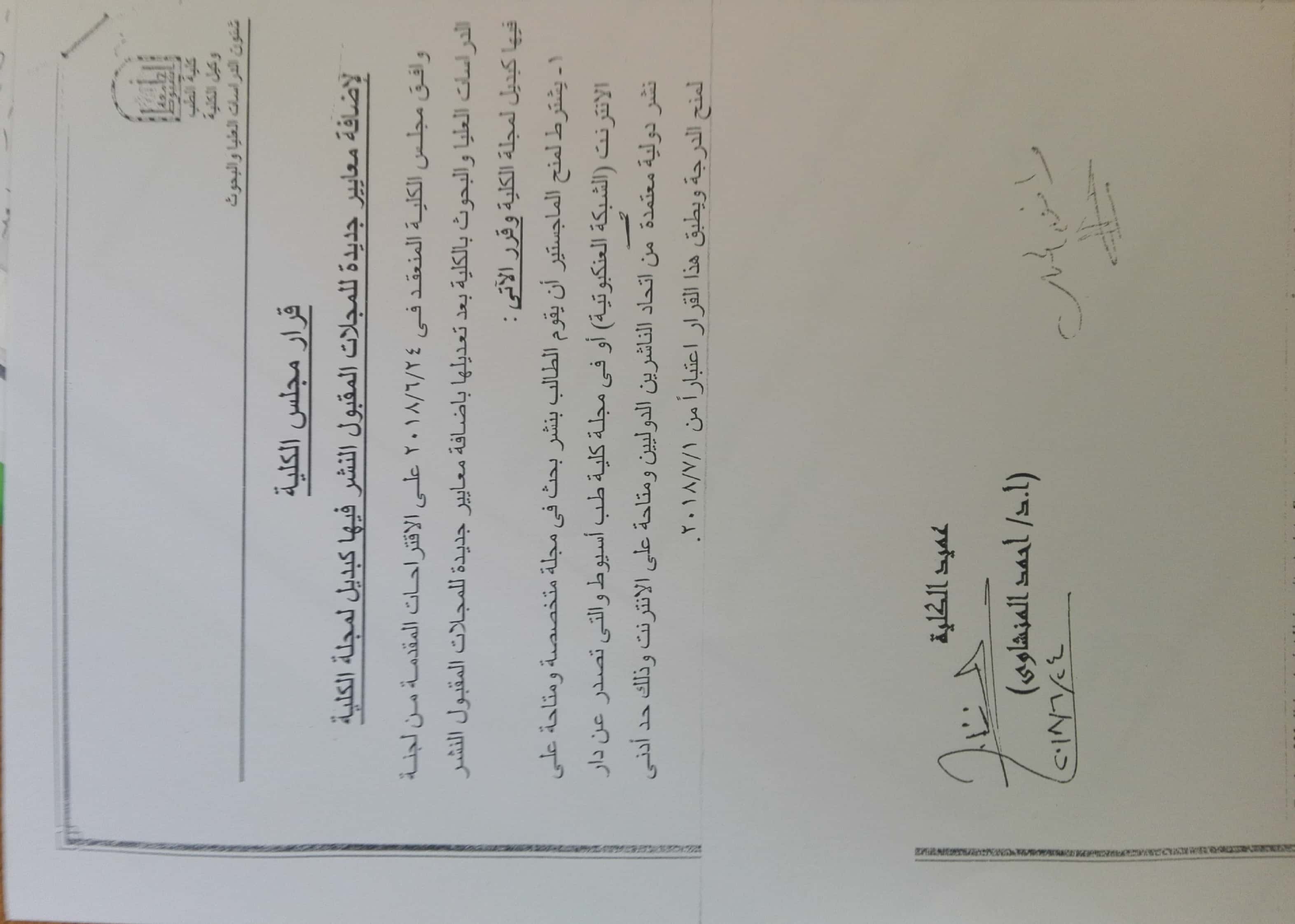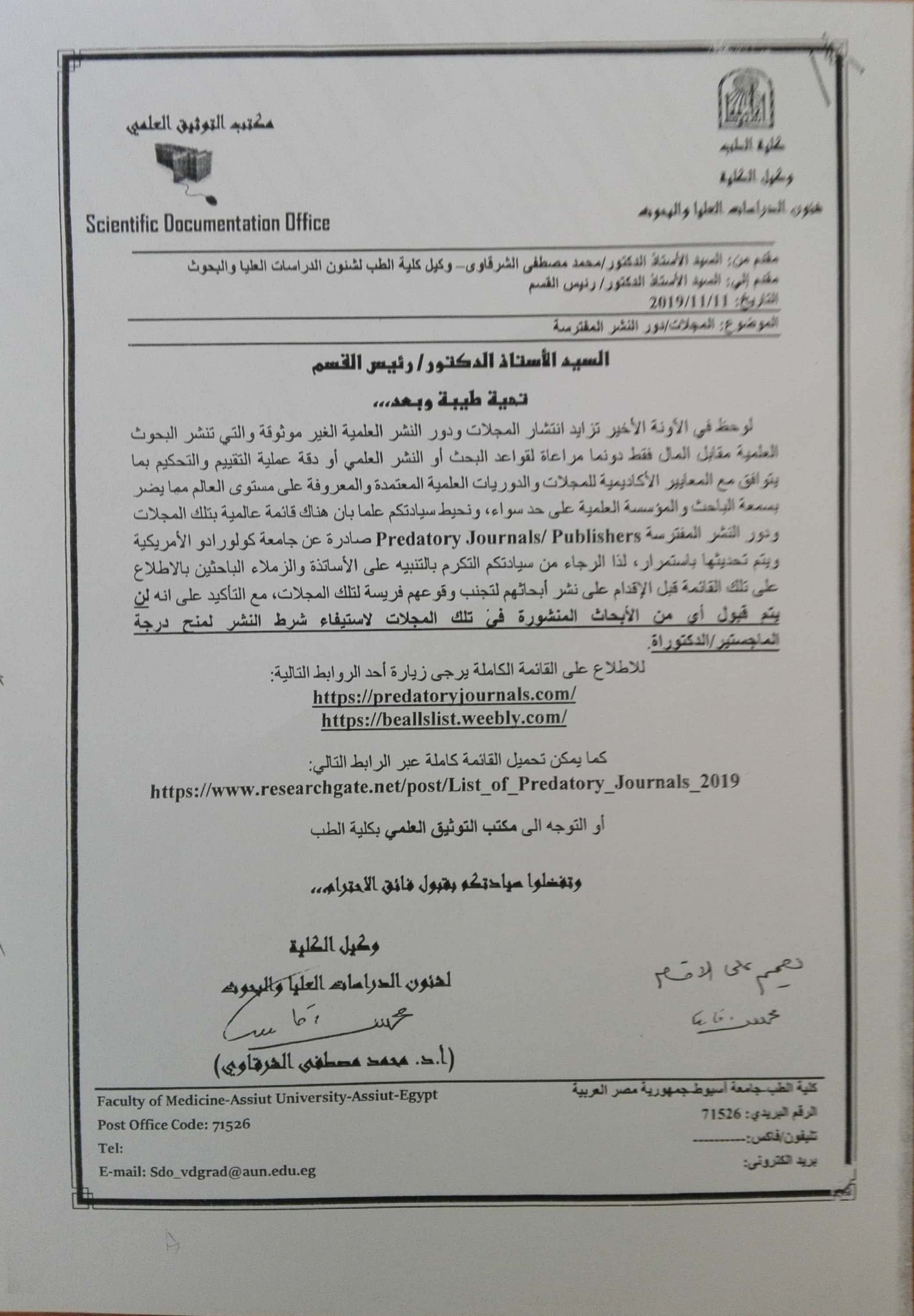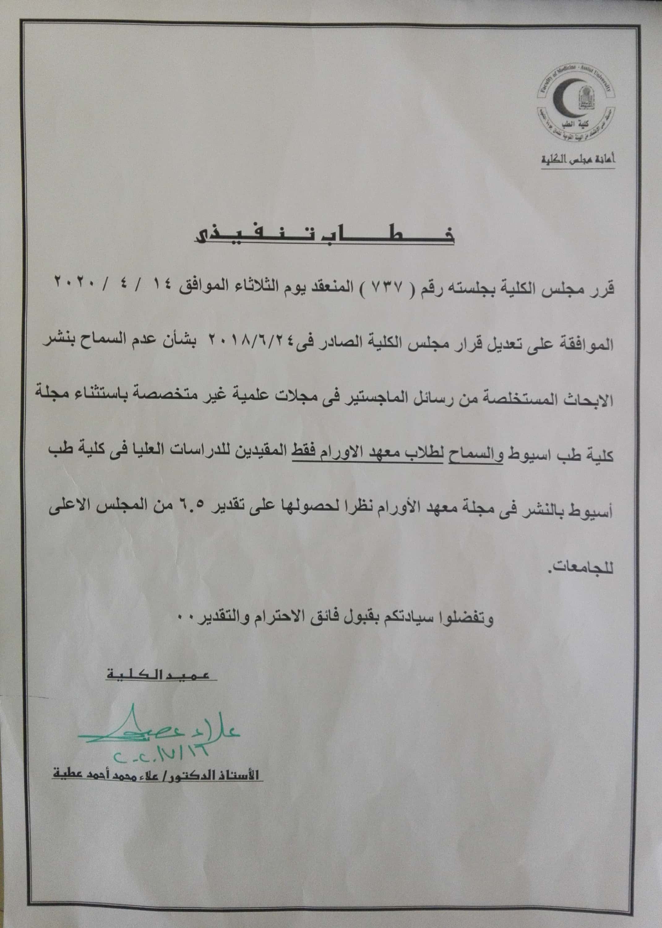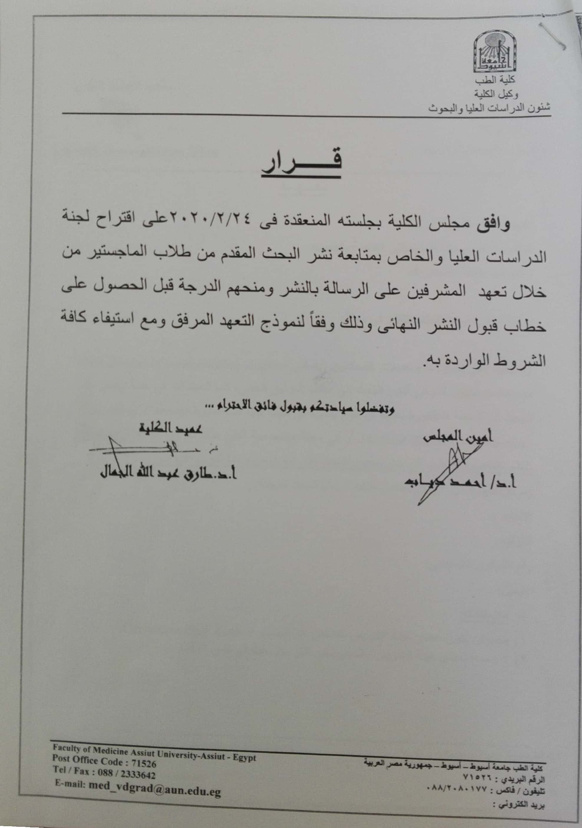 as to make sure researcher if fulfilling all publishing terms, should publish one scientific research from research’s abstract in Assiut Medical magazine or in other magazine. It should be for and available on internet (a copy from faculty’s council should be attached).