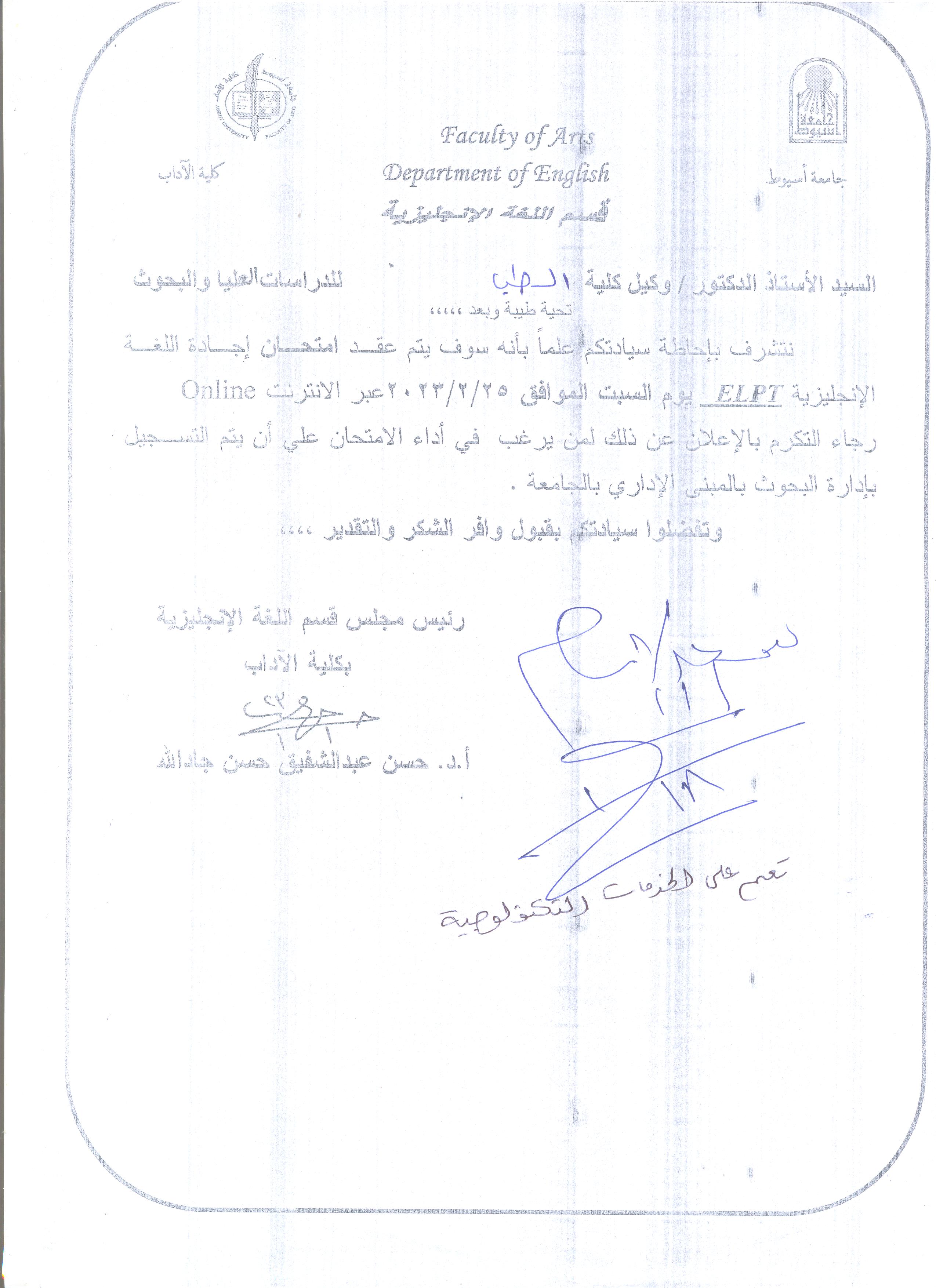 Announcement regarding holding the English language proficiency exam ELPT on Saturday 25-2-2023 24 January 2023