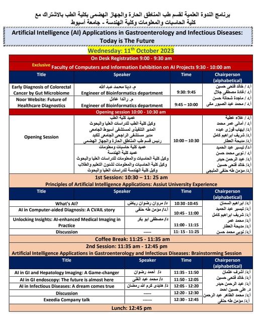 اعلان الندوة العلمية بعنوان " تطبيقات الذكاء الاصطناعي في أمراض الجهاز الهضمي والأمراض المعدية" تحت رعاية الدكتور أحمد المنشاوي -رئيس الجامعة الدكتور علاء عطية- عميد كلية الطب ورئيس مجلس إدارة المستشفيات الجامعية الدكتورة أماني عمر -وكيل الكلية لشئون الدراسات العليا والبحوث الدكتور إيهاب فوزي- المدير التنفيذي للمستشفيات الجامعية الدكتور شريف إبراهيم كامل- مدير مستشفى الراجحي. تأتي الندوة في إطار التعاون بين قسم طب المناطق الحارة والجهاز الهضمي بجامعة أسيوط وكلية الهندسة وكلية الحاسبات والمعلومات. بالتنسيق مع الدكتور نوبي محمد حسن -عميد كلية الهندسة الدكتورة تيسير حسن عبد الحميد- عميد كلية الحاسبات والمعلومات والدكتورة مديحة العطار- رئيس قسم طب المناطق الحارة والجهاز الهضمي. تستهدف الندوة التعرف على كيفية الاستعانة بالتكنولوجيا الحديثة للكشف المبكر عن أمراض الجهاز الهضمي لتجنب حدوث مضاعفات. يأتي اليوم بتنظيم من الدكتورة هايدي كرم الله رمضان، والدكتور أحمد رضوان رياض مقررا الندوة.