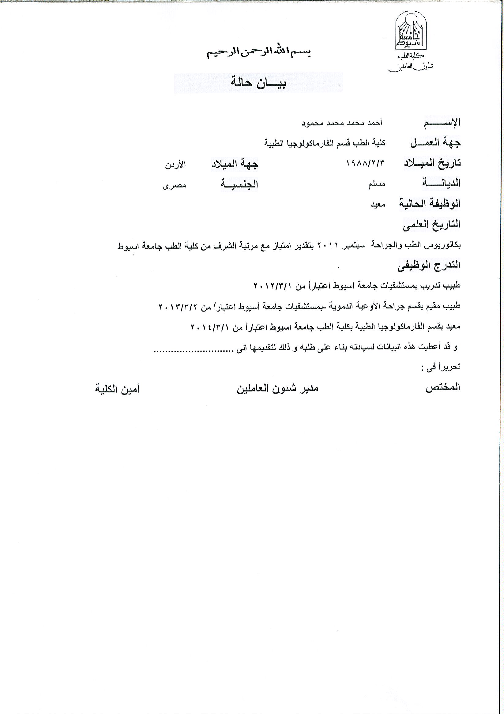 بكالوريوس ﻒﻳ الطب والجراحة () , كلية الطب جامعة اسيوط , 2011