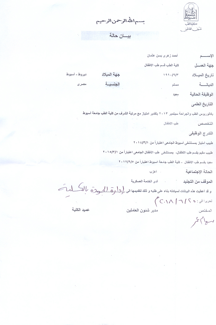 مدرس مساعد , كلية الطب , جامعة أسيوط ,2019