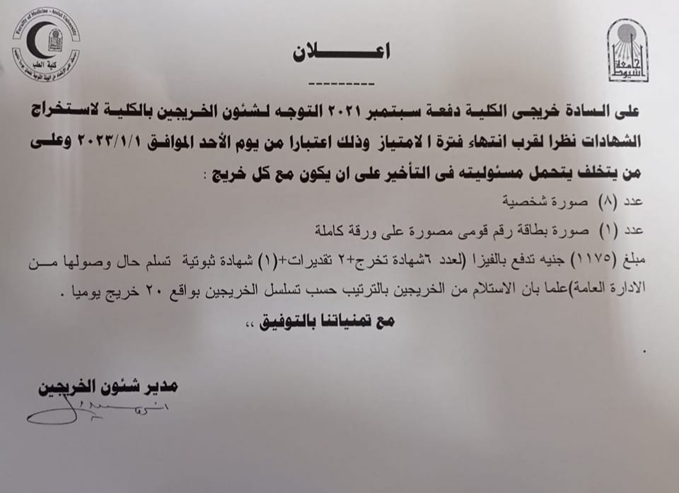 إعلان للسادة خريجى الكلية دفعة سبتمبر 2021
