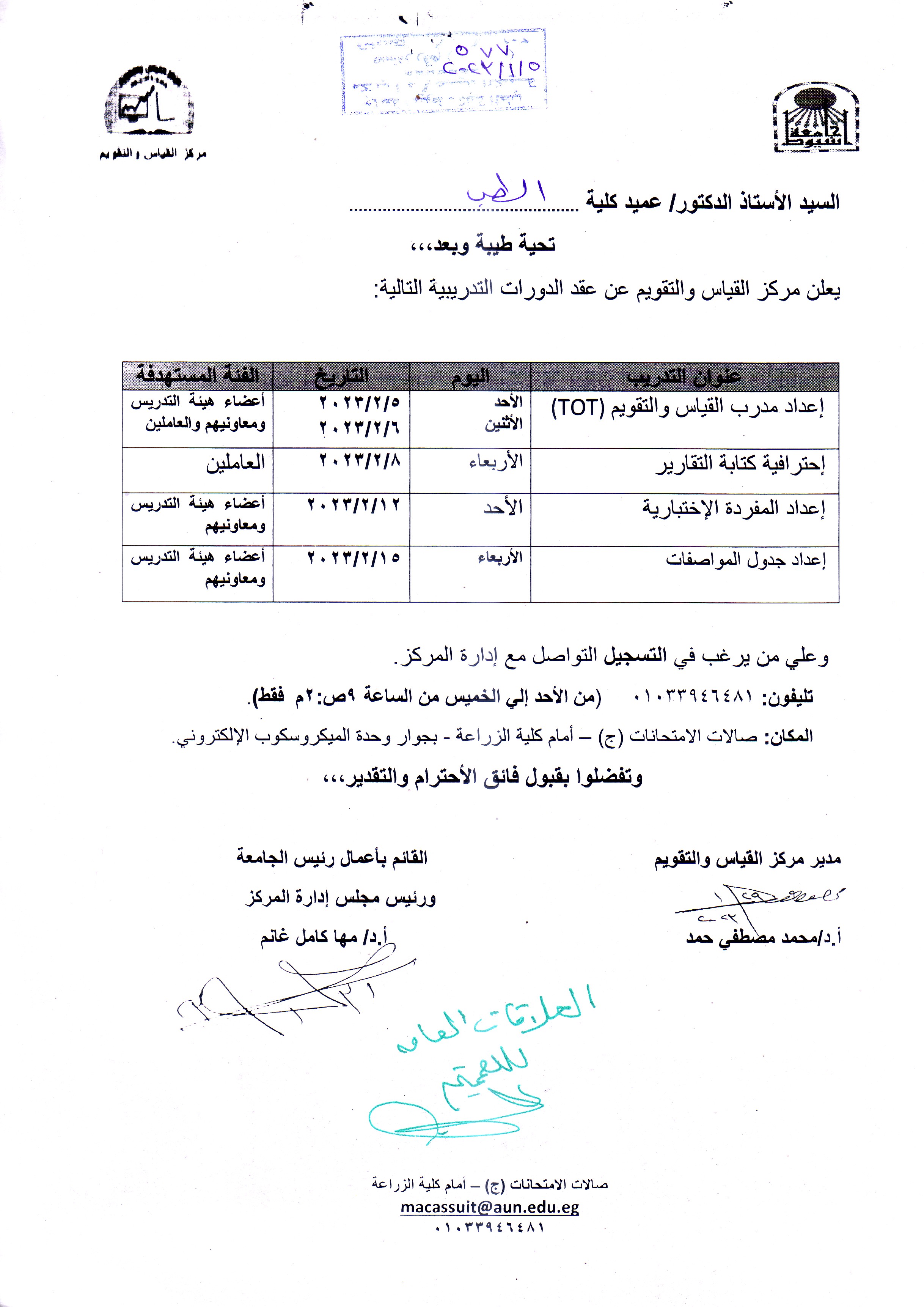 اعلان عن دورات تدريبية للسادة اعضاء هيئة التدريس ومعاونيهم