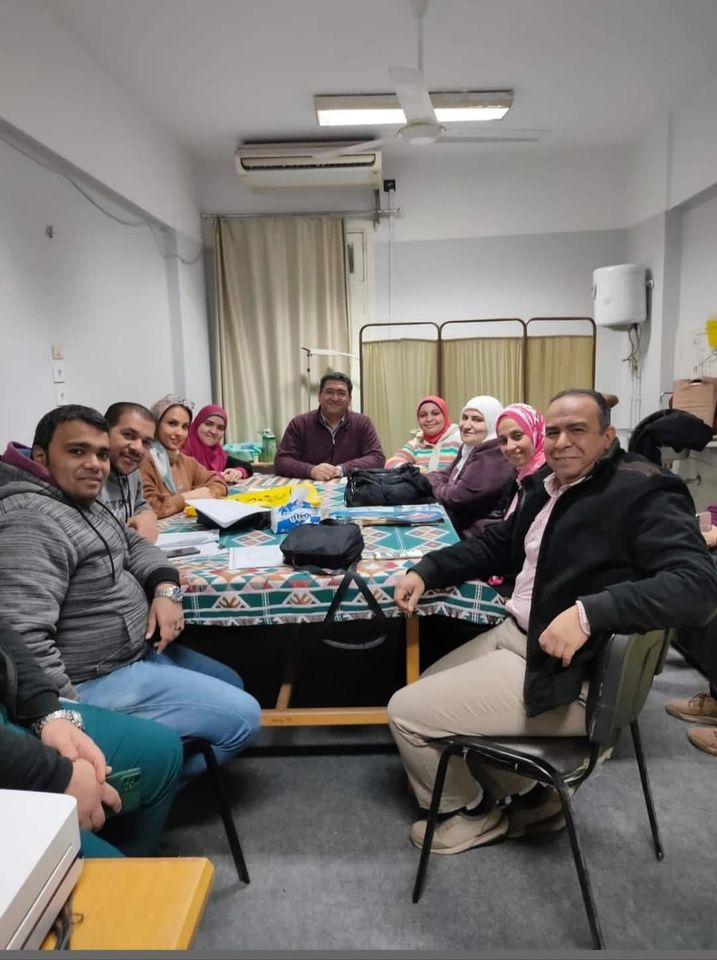 في قاعة الاجتماعات بوحدة أورام النساء بمستشفى صحة المرأة الجامعي؛ تم اللقاء العلمى الاسبوعي لمجموعة اساتذة اورام النساء من (٥ اقسام) وهم :