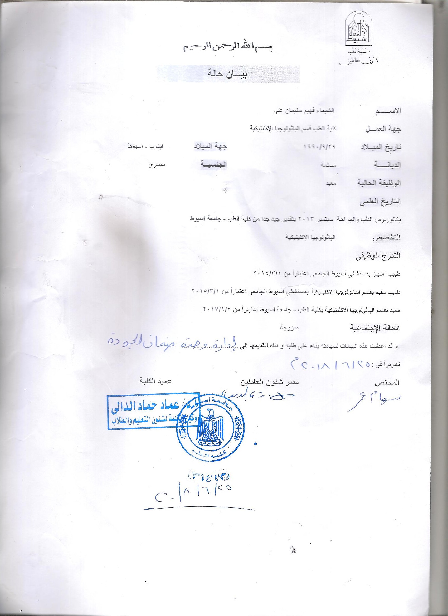 معيد كلية الطب , جامعة أسيوط , 2017