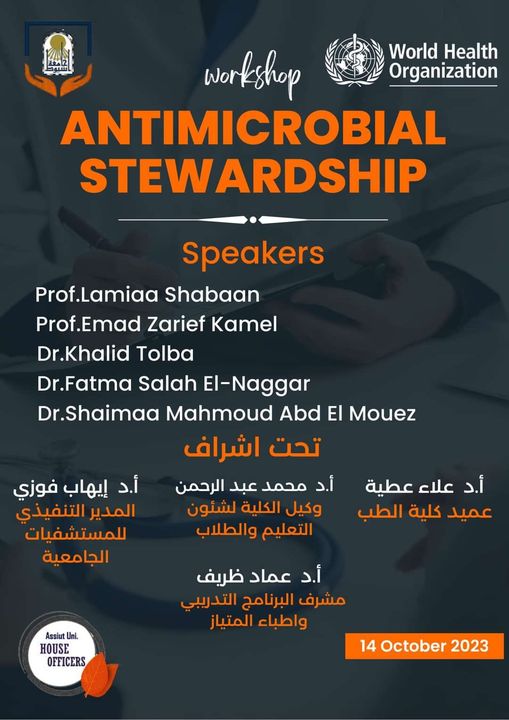 اليوم العلمي الثامن لطلاب الامتياز دفعة ٥٧ بعنوان "Antibiotic Stewardship" 10 أكتوبر 2023 اليوم العلمي الثامن لطلاب الامتياز دفعة ٥٧ بعنوان "Antibiotic Stewardship" السبت ١٤ اكتوبر ٢٠٢٣ بمجمع المدرجات بكلية الطب ،من الساعة ٢ظهرا وحتي السابعة مساءً