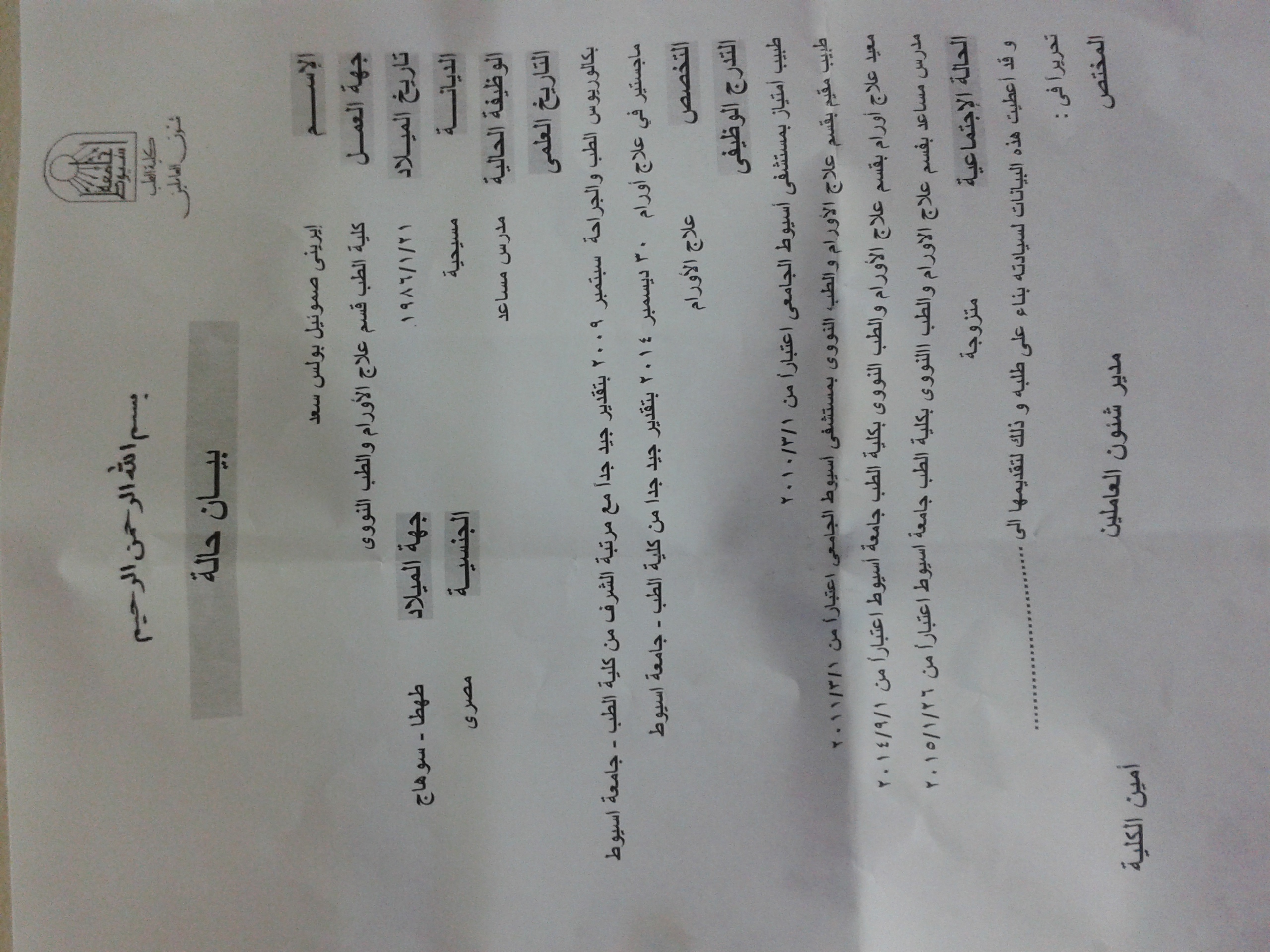 مدرس مساعد كلية الطب , جامعة أسيوط , 2015