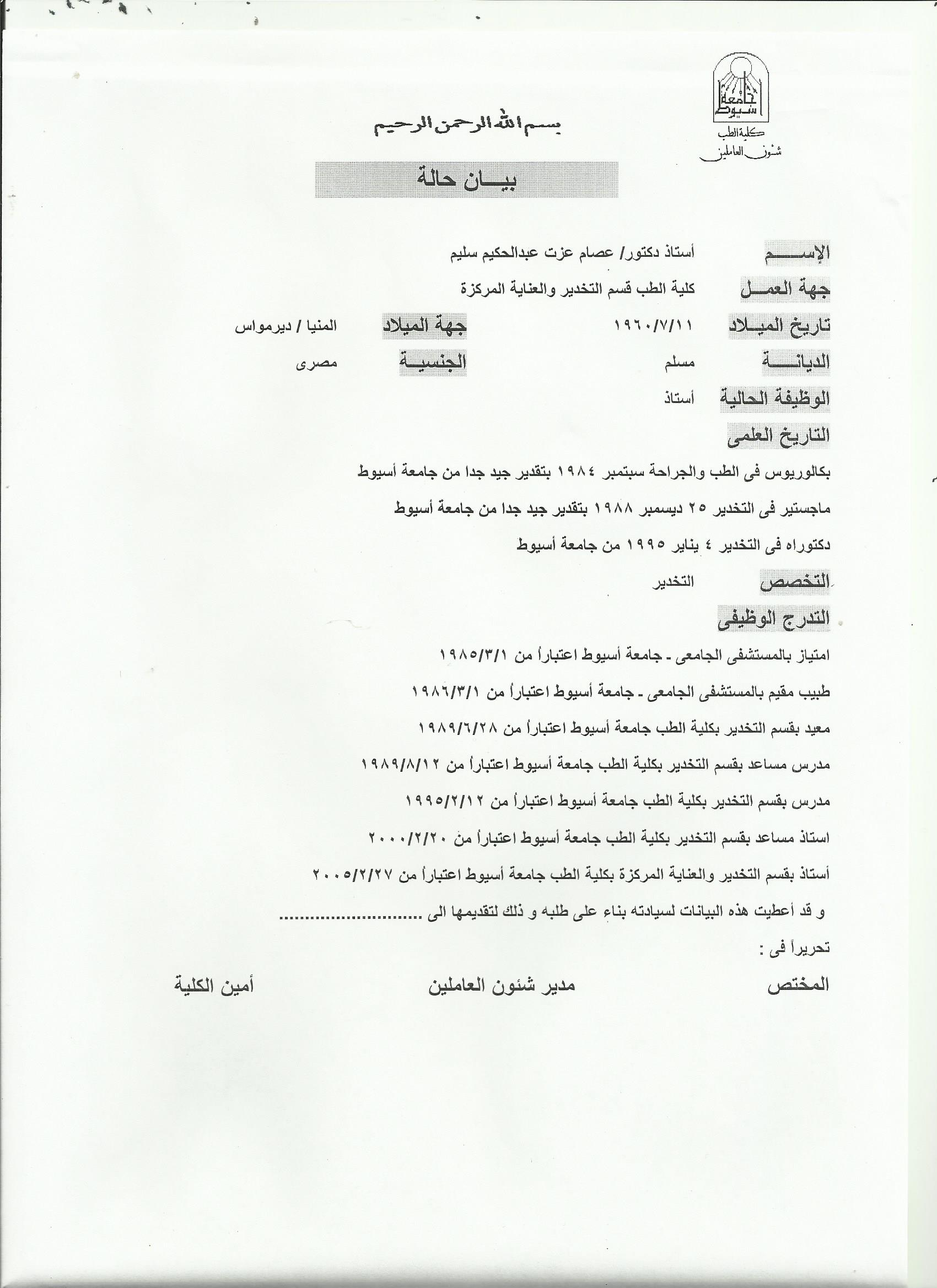 أستاذ مساعد كلية الطب , جامعة اسيوط , 2000