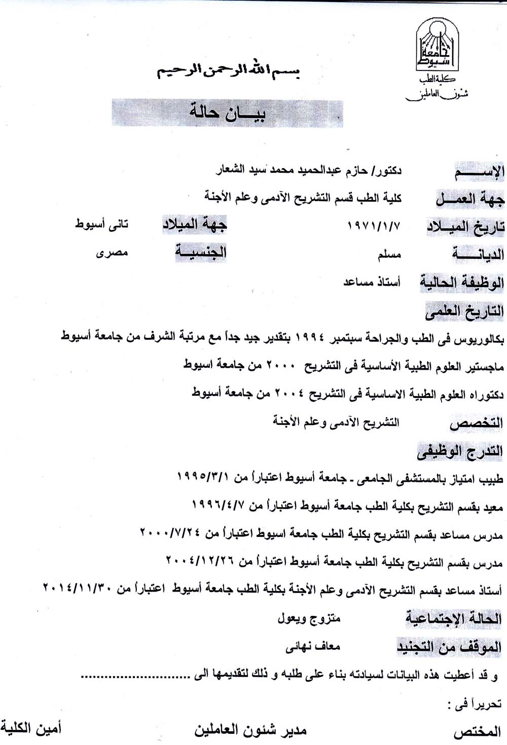 مدرس مساعد كلية الطب , جامعة اسيوط , 2000