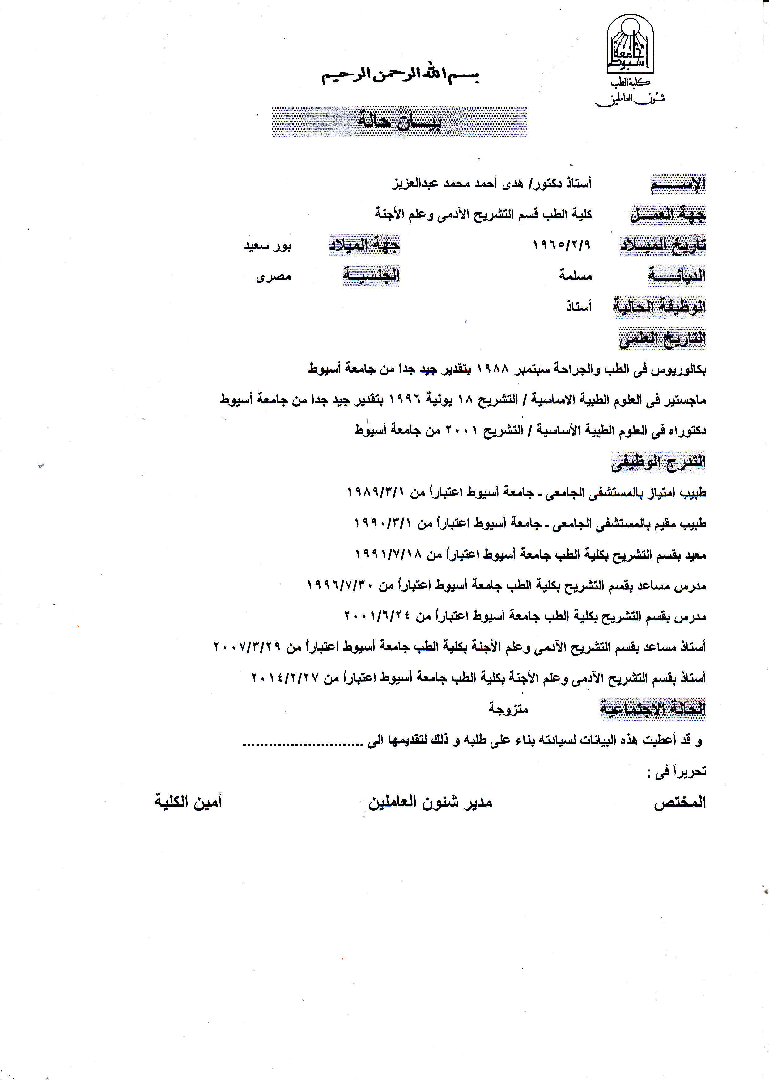 دكتوراه ﻒﻳ التشريح () , كلية الطب البشرى جامعه اسيوط , 2001