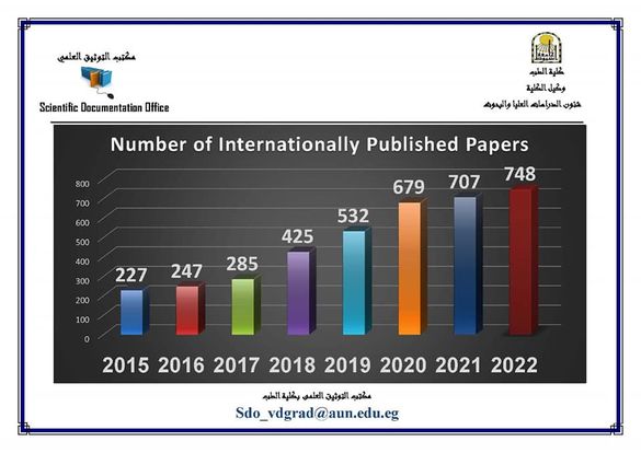 بحصول كلية الطب علي المركز الاول علي مستوي النشر الدولي وبنسبة ٣٠٪ من انتاج الجامعة وقد بلغ عدد الابحاث المنشورة دولياً هذا العام ٧٤٨ بحث من اجمالي ٢٣٦١ بالجامعة.