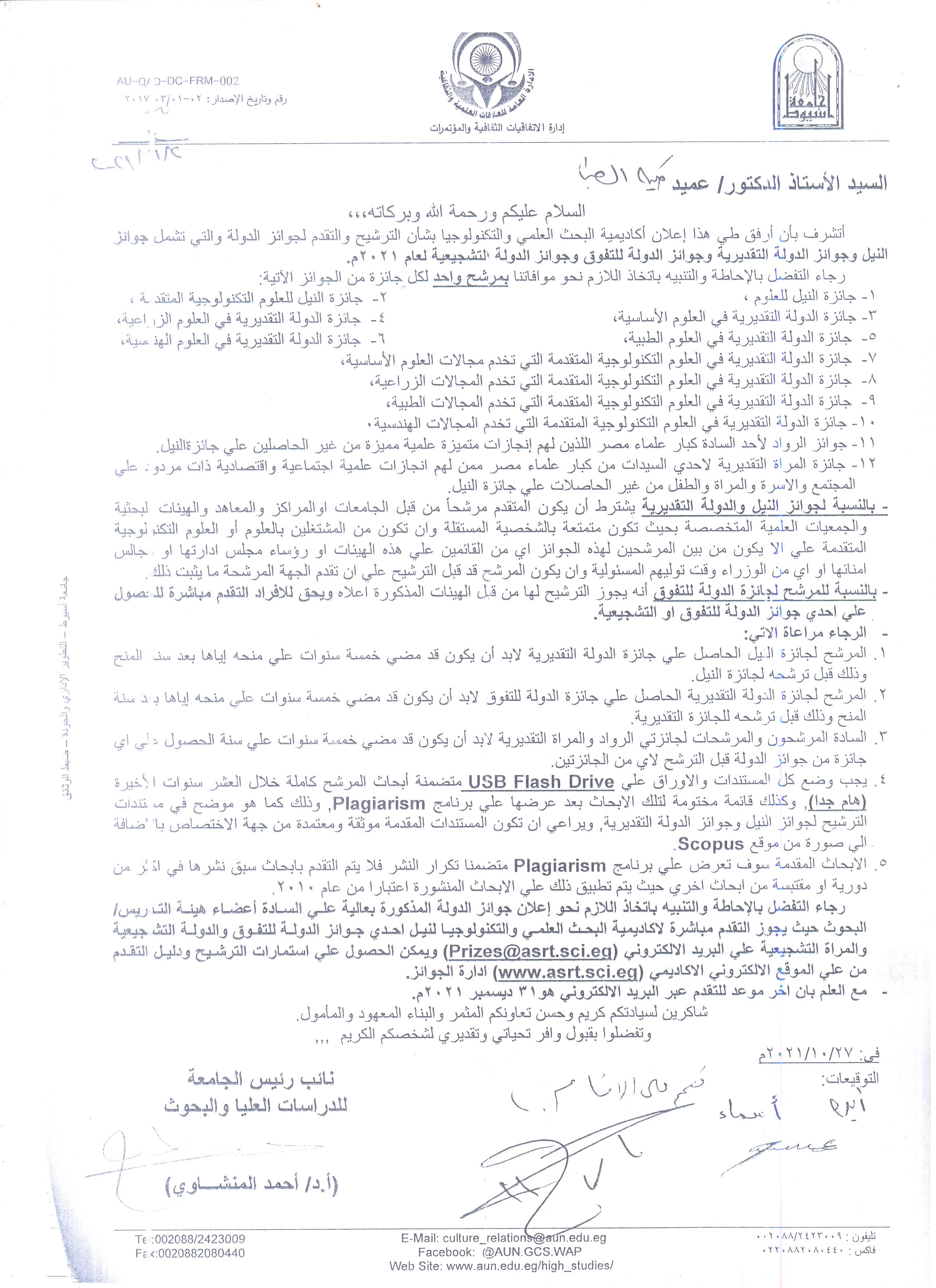 جوائز النيل وجوائز الدولة التقديرية والتفوق والتشجيعية لعام 2021 9 نوفمبر 2021 جوائز النيل وجوائز الدولة التقديرية والتفوق والتشجيعية لعام 2021