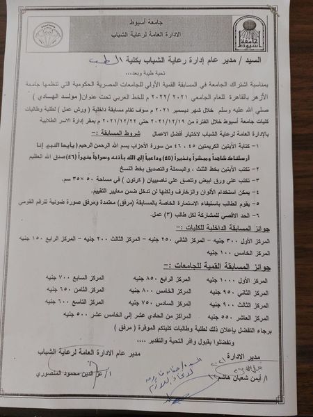 مسابقة الخط العربى تحت عنوان مولد الهادى - إدارة رعاية الشباب - كلية الطب