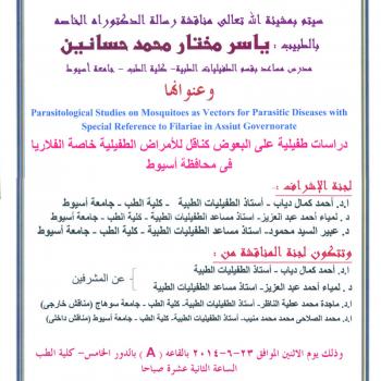 مناقشة رسالة الدكتوراه الخاصة بالطبيب/ ياسر مختار محمد حسانين المدرس المساعد بقسم الطفيليات الطبية