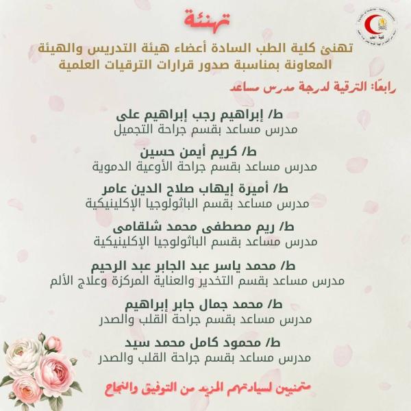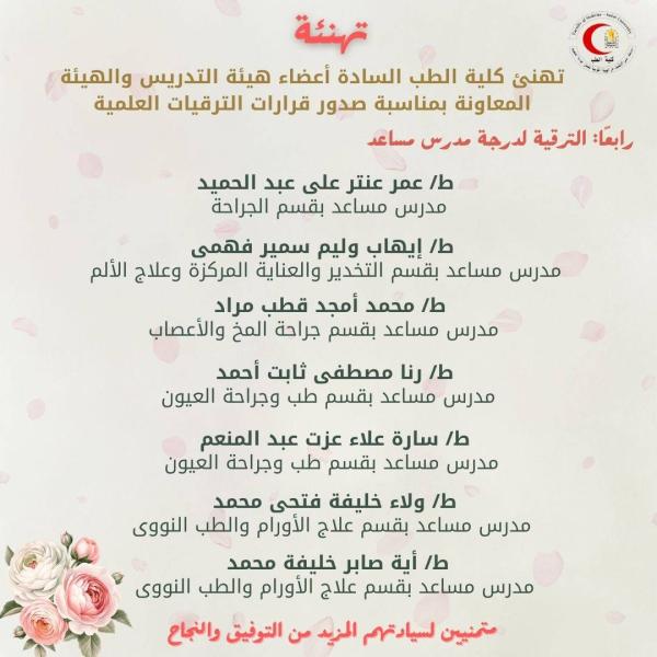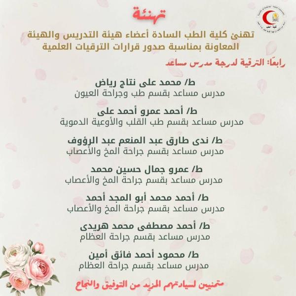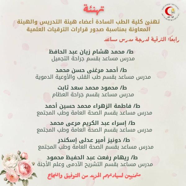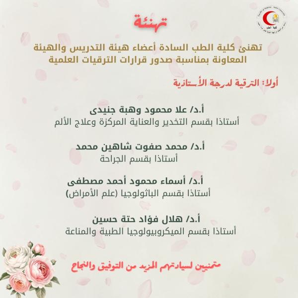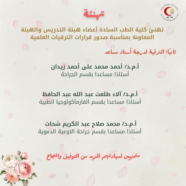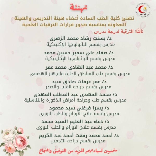 تهنئه 16 فبراير 2026 تهنئ كلية الطب السادة أعضاء هيئة التدريس والهيئة المعاونة بمناسبة صدور قرارات الترقيات العلمية