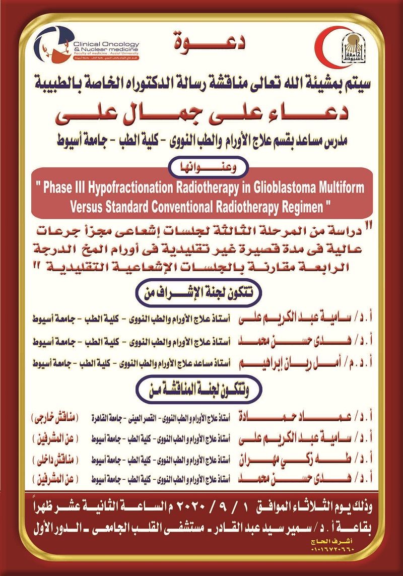 مناقشة رسالة الدكتوراه الخاصة بالطبيبة/ دعاء علي جمال علي - المدرس المساعد بقسم علاج الأورام والطب النووي
