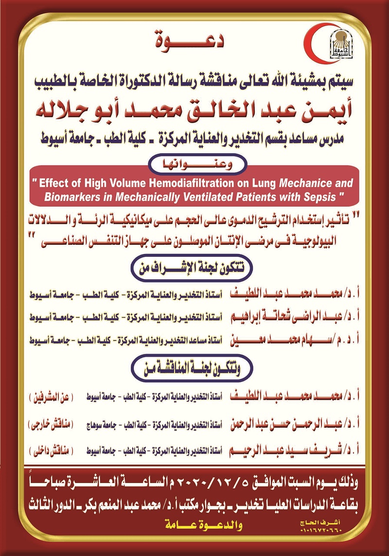 مناقشة رسالة الدكتوراه الخاصة بالطبيب/ أيمن عبد الخالق محمد أبو جلاله - المدرس المساعد بقسم التخدير والعناية المركزة