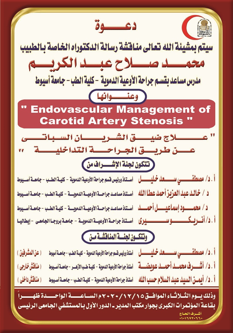 مناقشة رسالة الدكتوراه الخاصة بالطبيب/ محمد صلاح عبد الكريم - المدرس المساعد بقسم جراحة الأوعية الدموية