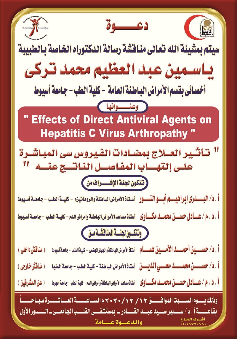 مناقشة رسالة الدكتوراه الخاصة بالطبيبة/ ياسمين عبد العظيم محمد تركي - المدرس المساعد بقسم الأمراض الباطنة