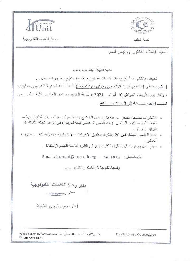 وسيتم إستخدام منصة مايكروسوفت تيمز فى عقد وتنفيذ التدريب على أن يتم موافاة سيادتكم بالرابط فى حينه