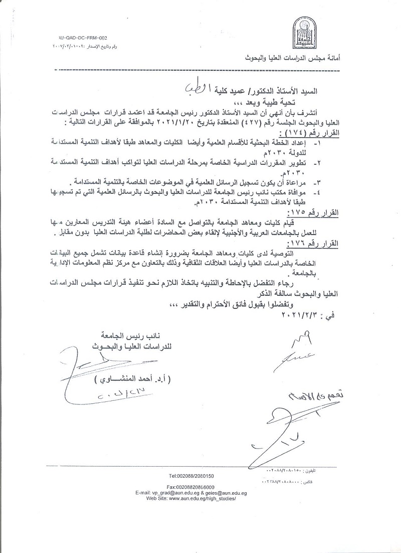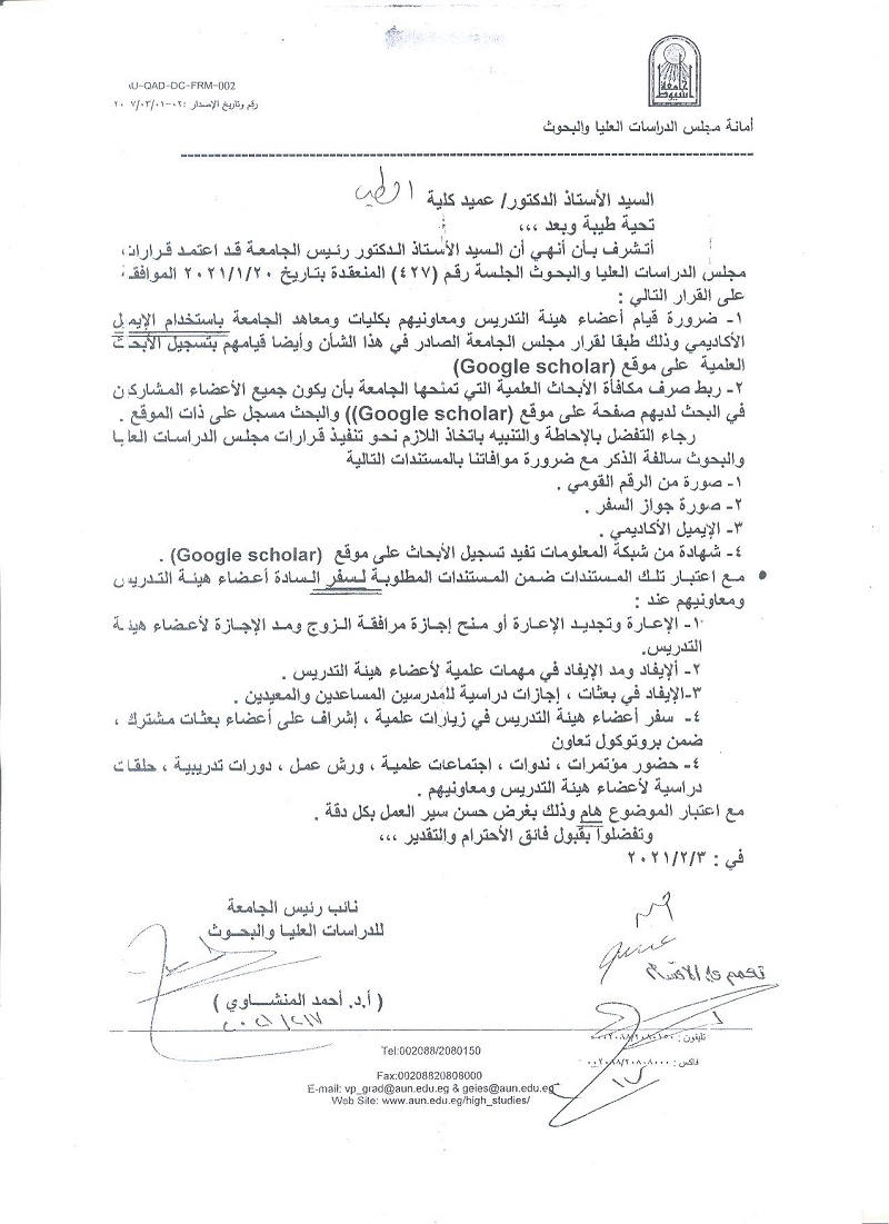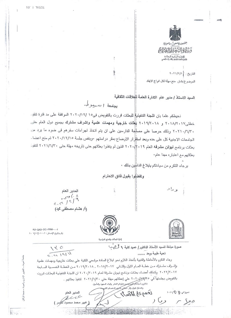 الموافقة على مد فترة تنفيذ خطتي 2017/2018 و 2018/2019 للبعثات الخارجية والمهمات العلمية والاشراف المشترك