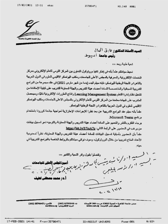 برتوكول التعاون بين المركز القومى للتعلم الالكترونى بالمجلس الاعلى للجامعات ومكتب اليونسيكو الاقليمى Read more about برتوكول التعاون بين المركز القومى للتعلم الالكترونى بالمجلس الاعلى للجامعات ومكتب اليونسيكو الاقليمى برتوكول التعاون بين المركز القومى للتعلم الالكترونى بالمجلس الاعلى للجامعات ومكتب اليونسيكو الاقليمى 1 مارس 2021
