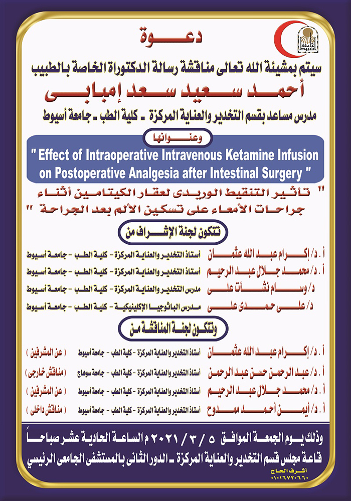 مناقشة رسالة الدكتوراه الخاصة بالطبيب/ أحمد سعيد سعد إمبابي - المدرس المساعد بقسم التخدير والعناية المركزة Read more about مناقشة رسالة الدكتوراه الخاصة بالطبيب/ أحمد سعيد سعد إمبابي - المدرس المساعد بقسم التخدير والعناية المركزة مناقشة رسالة الدكتوراه الخاصة بالطبيب/ أحمد سعيد سعد إمبابي - المدرس المساعد بقسم التخدير والعناية المركزة 4 مارس 2021