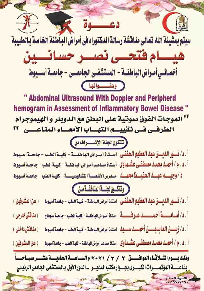 مناقشة رسالة الدكتوراه الخاصة بالطبيبة/ هيام فتحي نصر حسانين - المدرس المساعد بقسم الأمراض الباطنة Read more about مناقشة رسالة الدكتوراه الخاصة بالطبيبة/ هيام فتحي نصر حسانين - المدرس المساعد بقسم الأمراض الباطنة مناقشة رسالة الدكتوراه الخاصة بالطبيبة/ هيام فتحي نصر حسانين - المدرس المساعد بقسم الأمراض الباطنة 1 مارس 2021