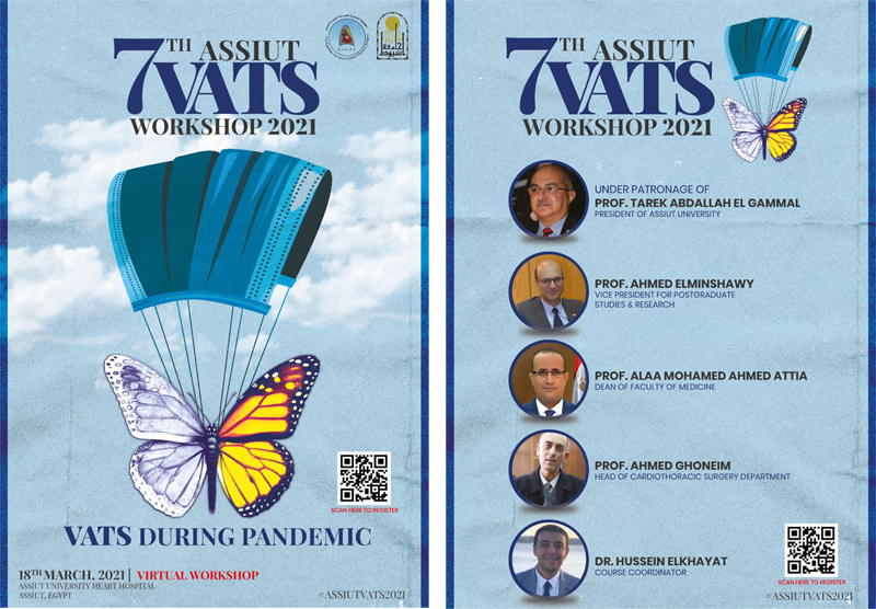 برعاية كريمة من أ.د/ طارق الجمال - رئيس جامعة أسيوط و أ.د/ أحمد المنشاوى - نائب رئيس الجامعة لشئون الدراسات العليا والبحوث وبالتعاون مع الجمعية المصرية لجراحة القلب والصدر ينظم قسم جراحة القلب والصدر بكلية الطب جامعة أسيوط تحت رئاسة أ.د/ أحمد فتحى غنيم - رئيس الورشة ورئيس قسم جراحة القلب والصدر للعام السابع على التوالي ورشة منظار الصدر الجراحي التفاعلية virtual meeting والذي يشرف هذه السنة بإستضافة عدد من الخبراء الأجانب في هذا المجال الدقيق إضافة إلى الخبراء المصريين وذلك لتدريب شباب الأطباء على هذه التقنية الجديدة التي من شأنها أن تساعد على إجراء الجراحة من فتحات صغيرة بجدار الصدر الجانبي عوضاً عن الجرح التقليدي مما يؤدي الي إحساس أقل بالألم بعد العملية وفترة نقاهة أقل وعودة أسرع للعمل.