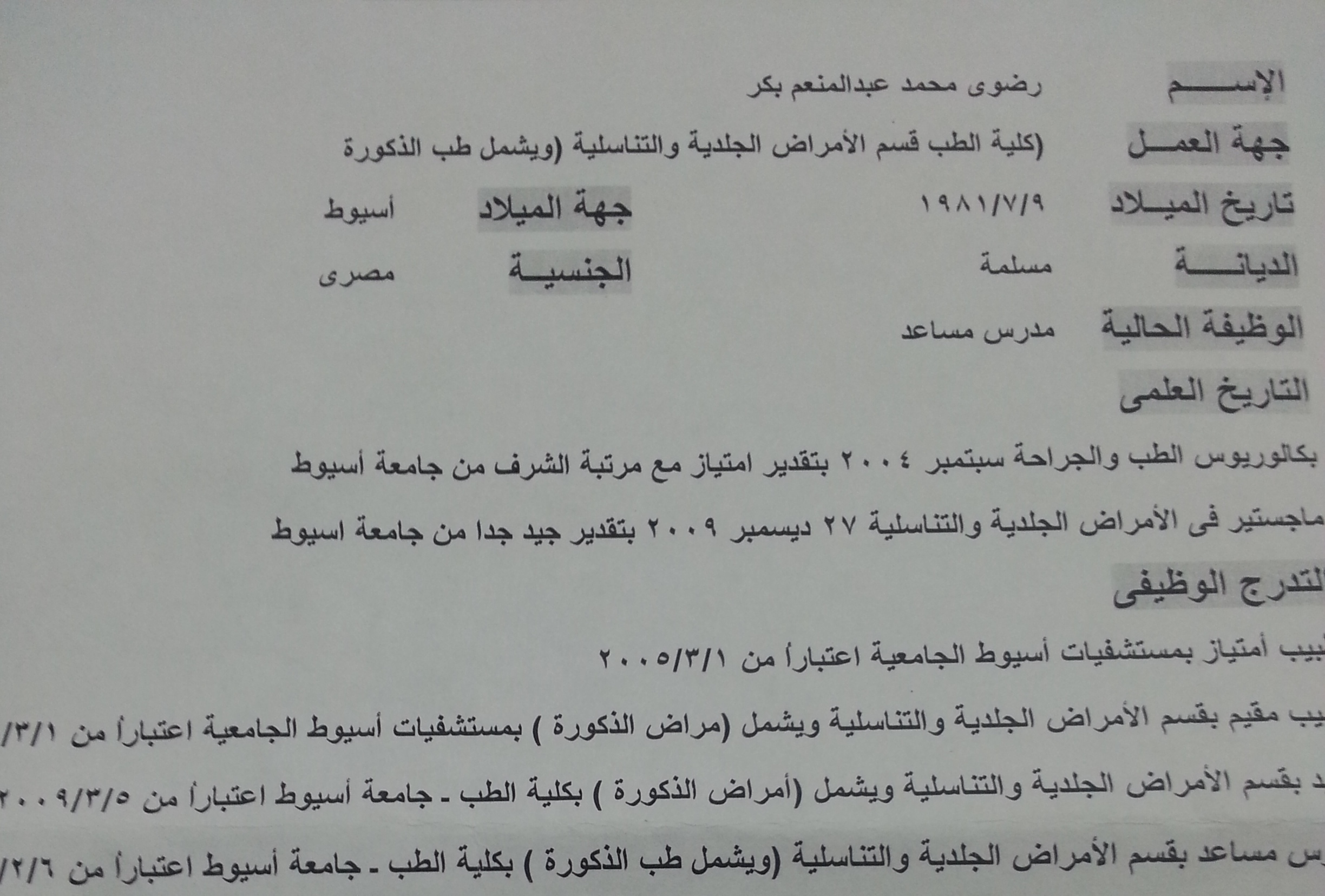 معيد كلية الطب , جامعة اسيوط , 2009