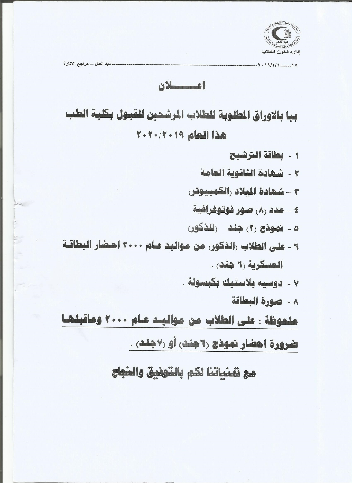 - أصل البطاقه العسكرية (6 جند) للطلاب الذكور الذين أتموا 19 عاما.