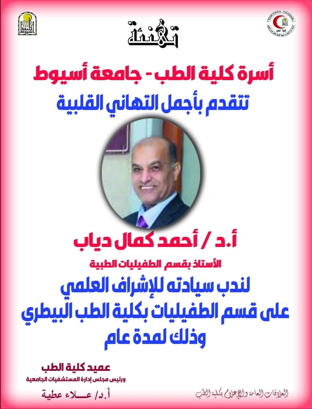 تهنئة السيد أ.د/ أحمد كمال دياب لندب سيادته للإشراف على قسم الطفيليات بكلية الطب البيطرى 3 يناير 2023