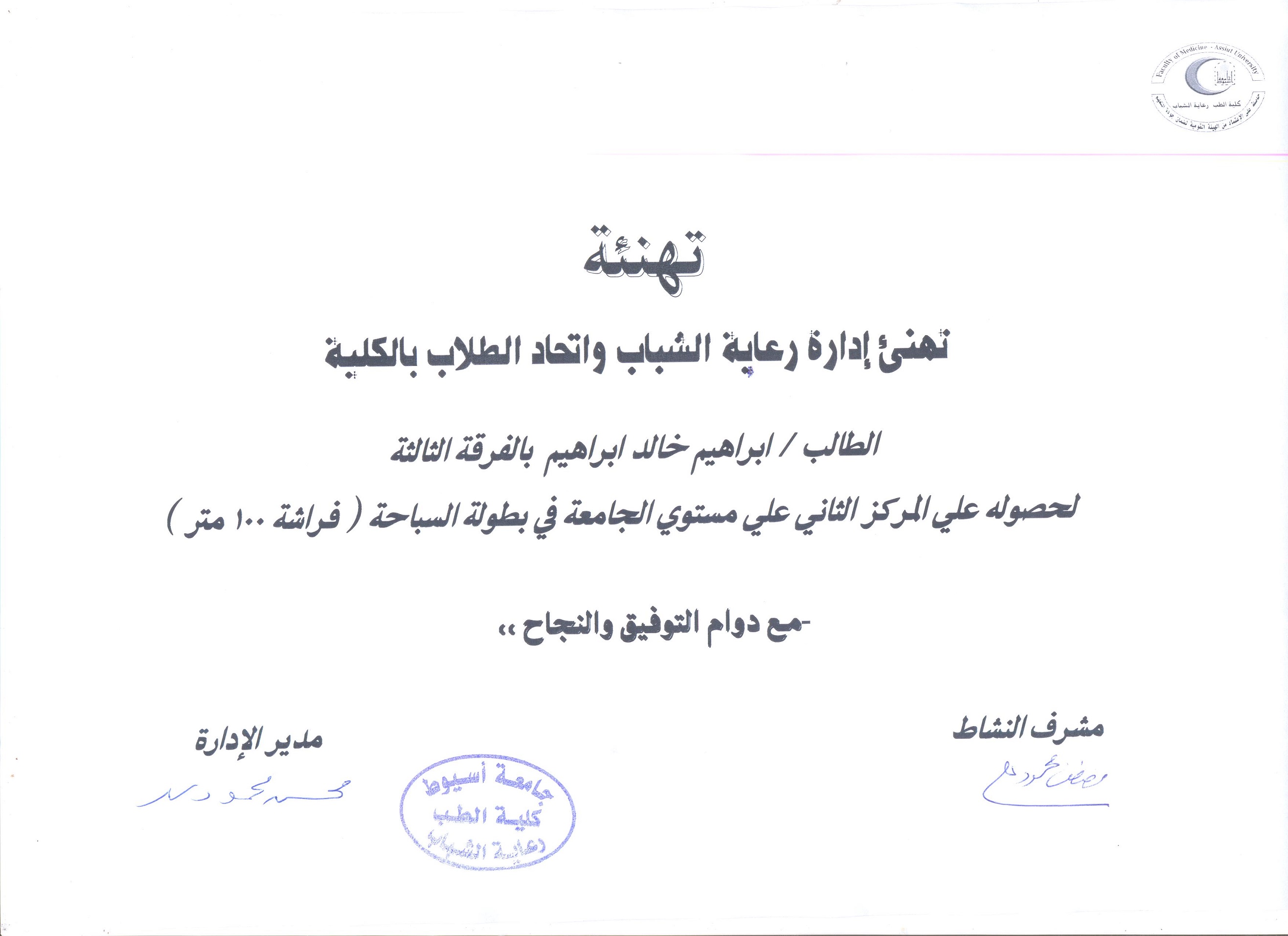 لحصوله على المركز الثانى على مستوى الجامعة فى بطولة السباحة (فراشة 100 متر)