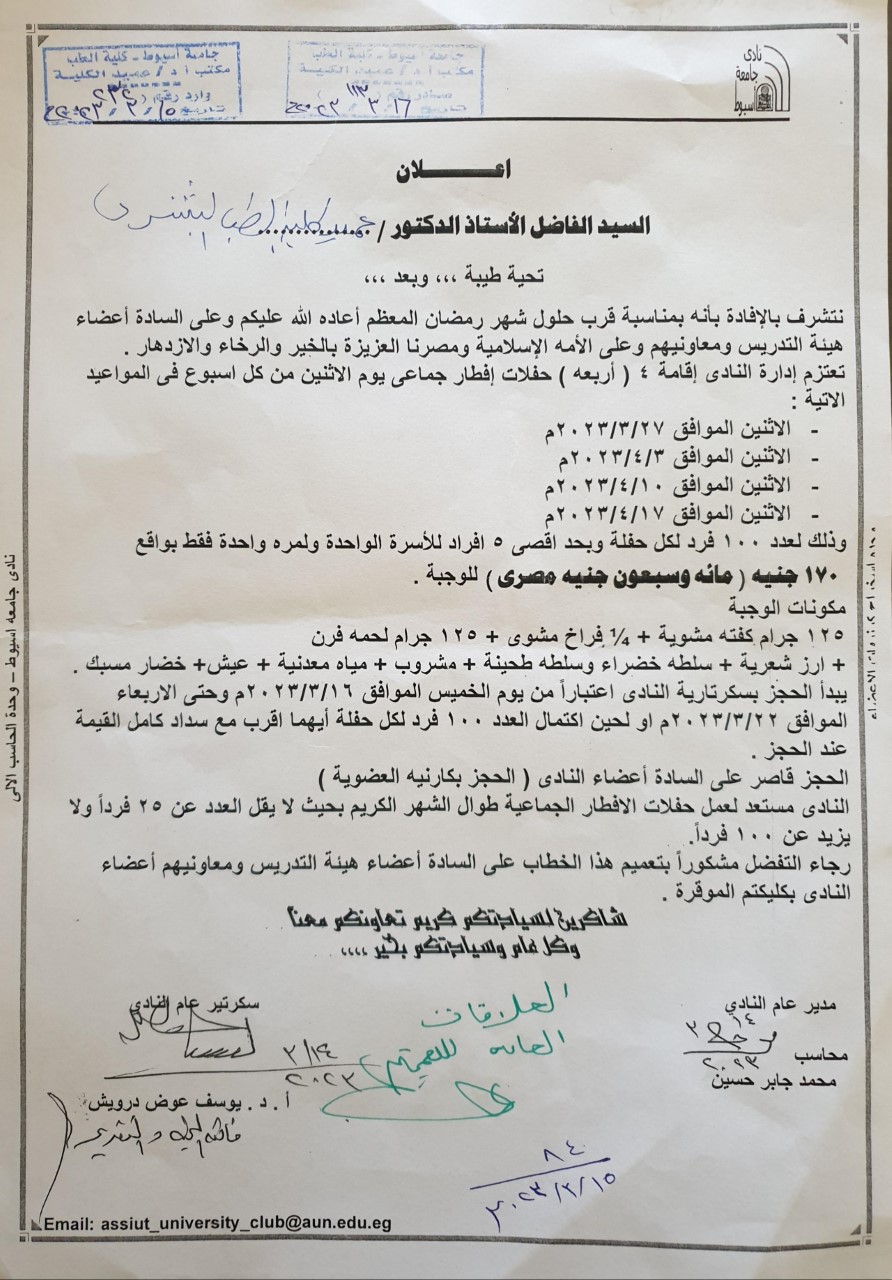 Assiut University Club announces the establishment of four group iftar parties on Monday of every week during the holy month of Ramadan 16 March 2023