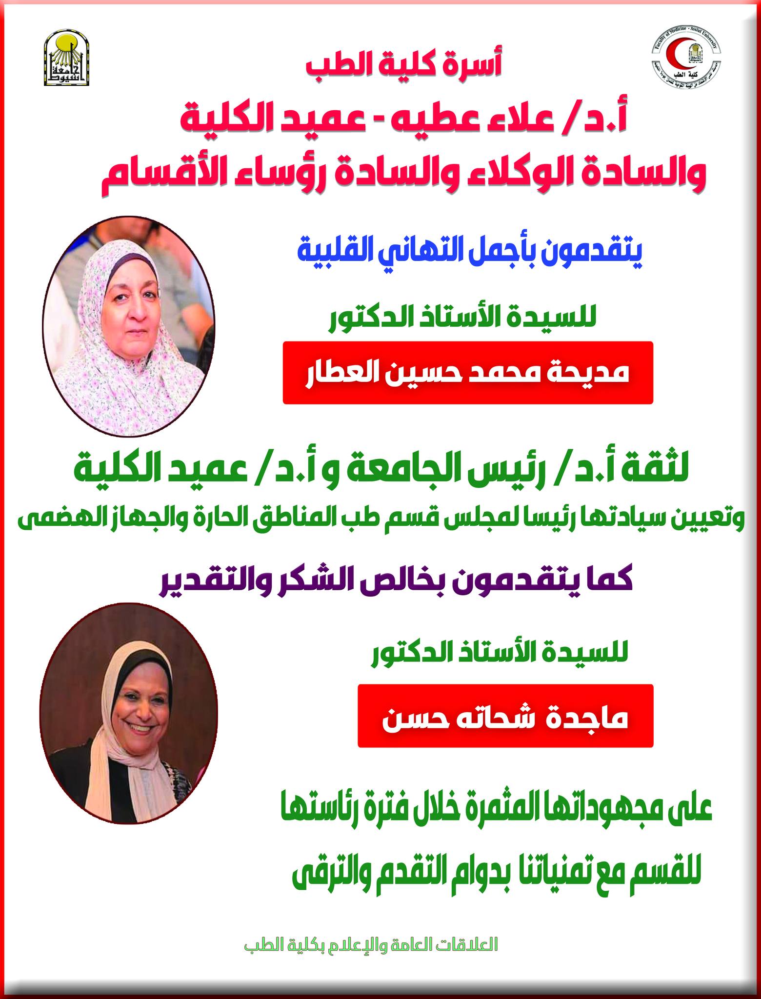 Congratulations to Mrs. Prof. Dr. Madiha Muhammad Hussein Al-Attar - for her appointment as Chairman of the Council of the Department of Tropical Medicine and Gastroenterology.