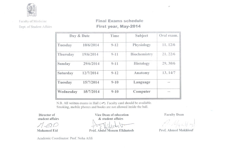 Foreign Students (Malaysian) Final Exams Schedule, First Year 13 April 2014 Foreign Students (Malaysian) Final Exams Schedule, First Year