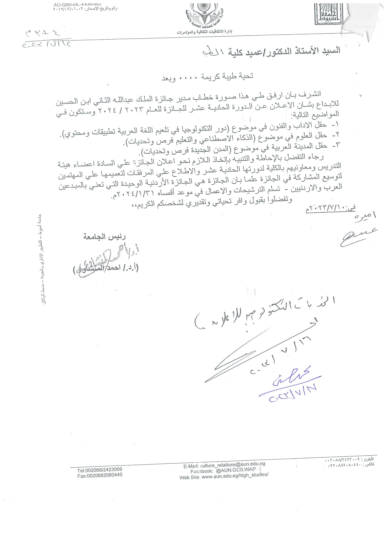 Announcement regarding King Abdullah II Bin Al Hussein Award for Creativity