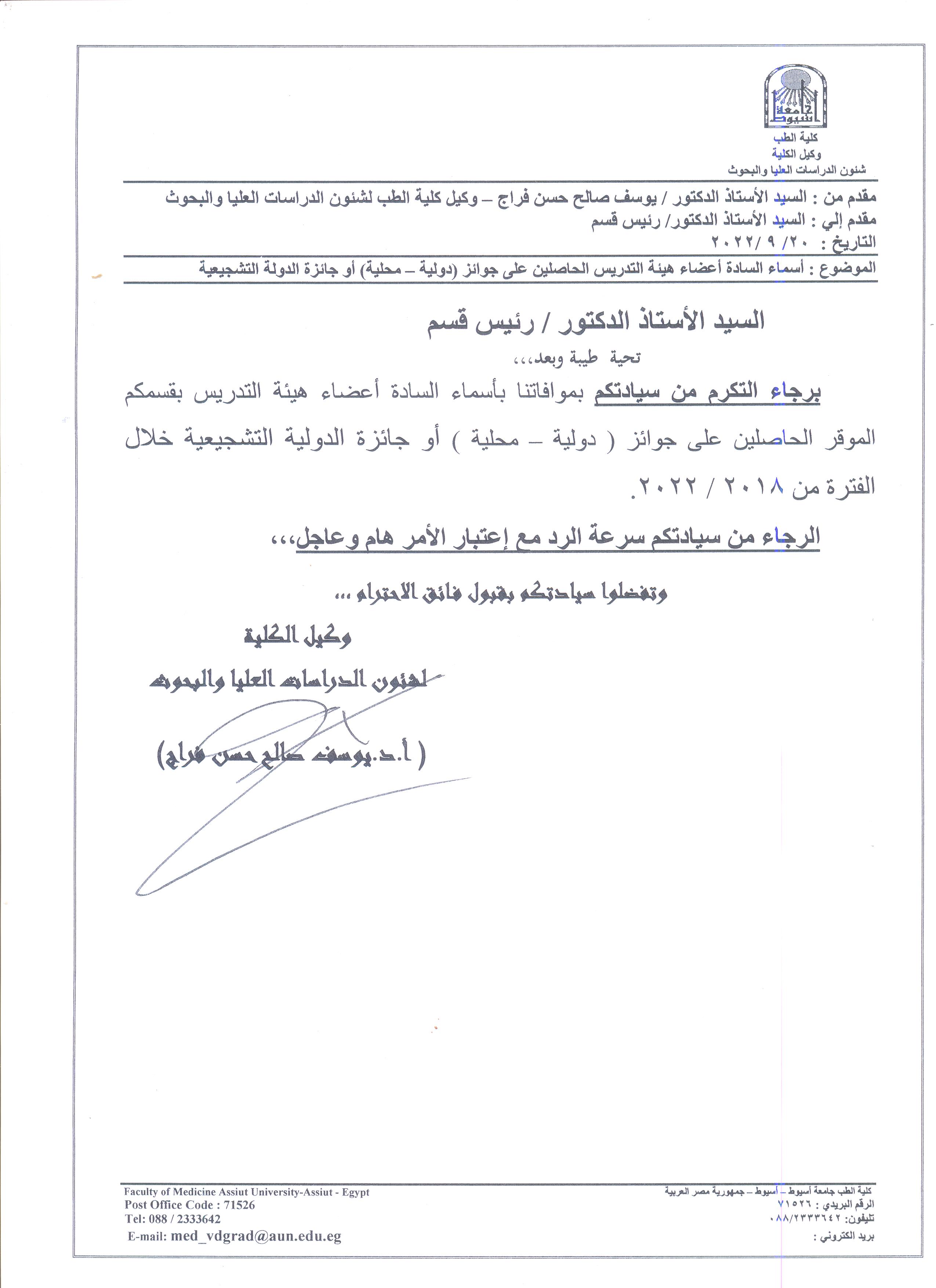 Announcement regarding the names of the faculty members who have received awards (international - local) or the State Incentive Award 21 September 2022