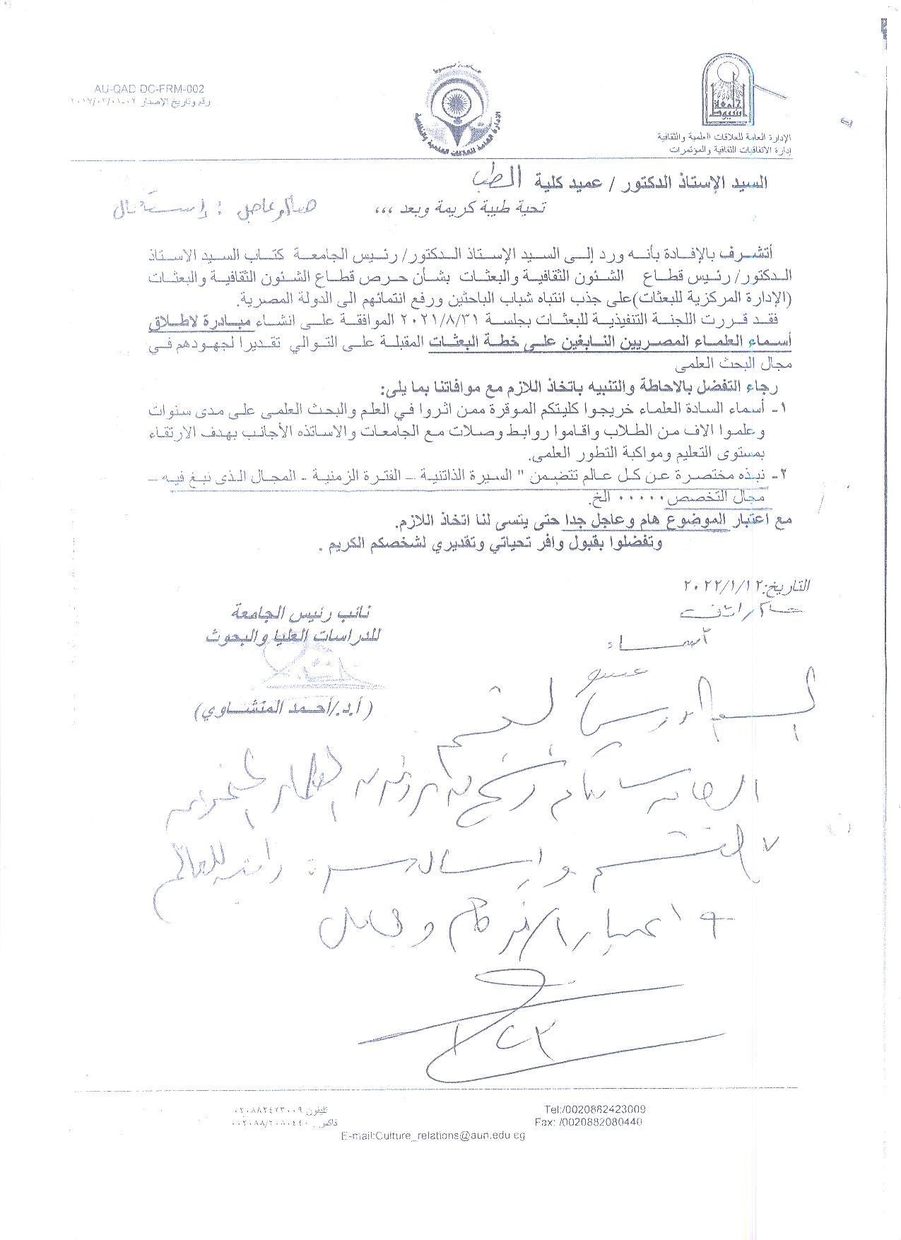 إعلان بشأن إنشاء مبادرة لإطلاق أسماء العلماء المصريين النابغين على خطة البعثات