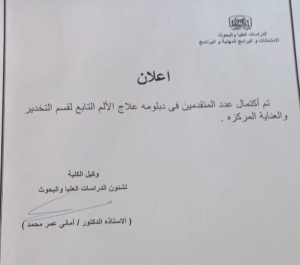 إعلان بشأن دبلومة علاج الألم - التابع لقسم التخدير والعناية المركزة وعلاج الألم