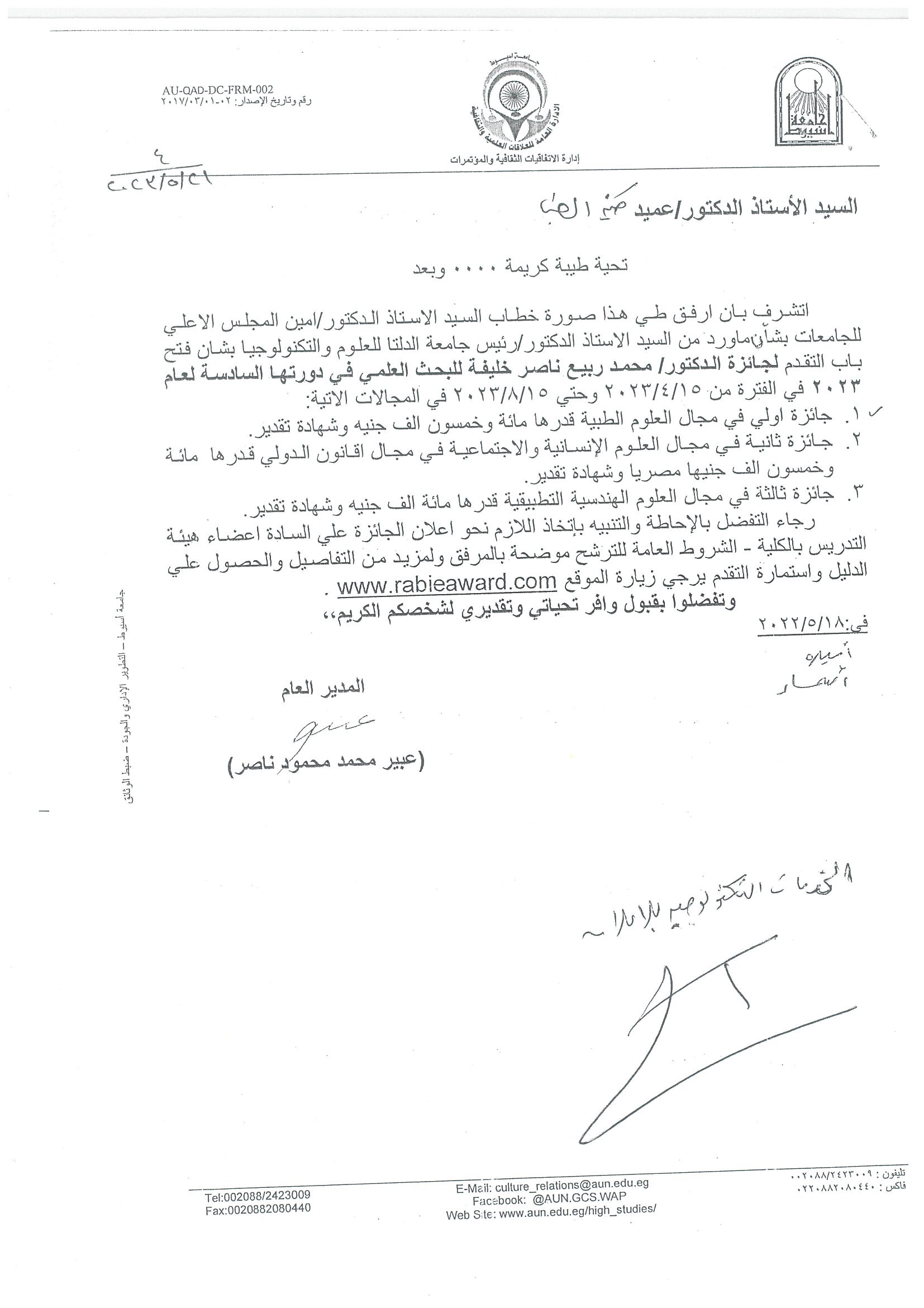 اعلان بشأن فتح باب التقدم لجائزه الدكتور محمد ربيع ناصر خليفه للبحث العلمى فى دورتها السادسه لعام 2023 28 مايو 2023