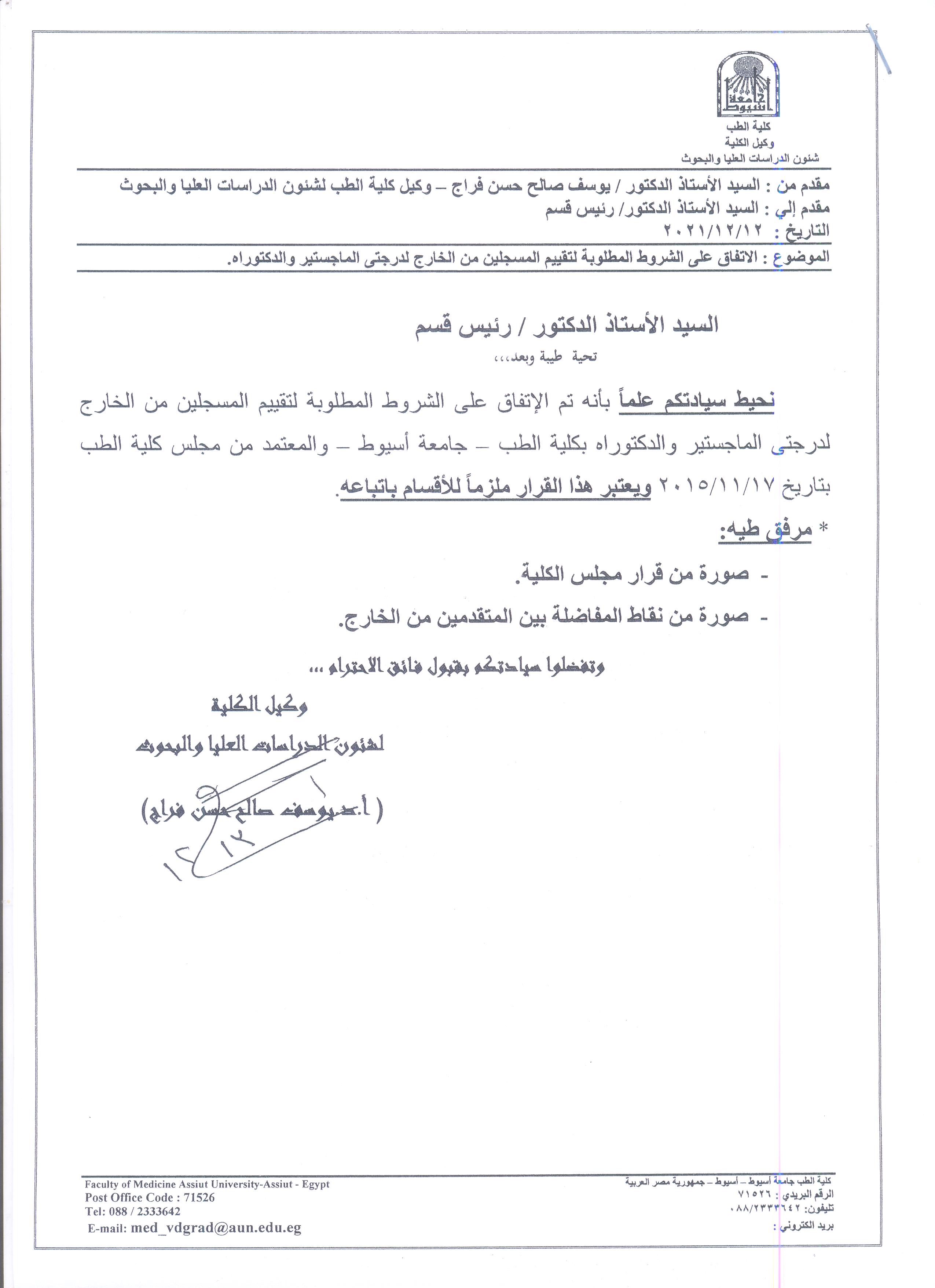 الاتفاق على الشروط المطلوبة لتقييم المسجلين من الخارج لدرجتى الماجستير والدكتوراة