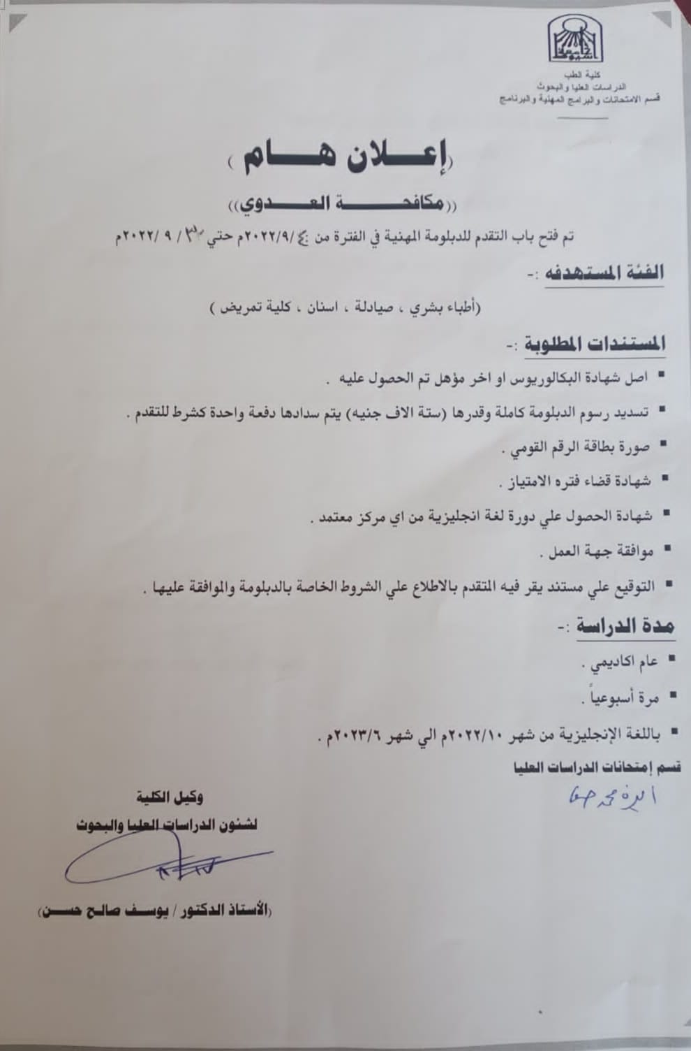 ٩ ديسمبر .... كلية الطب تناقش المخاطر الصحية والمجتمعية للمنشطات الرياضية في اليوم البيئي المجتمعي الثامن للكلية