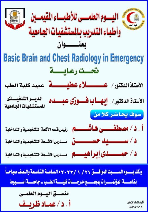 اليوم العلمي للأطباء المقيمين وأطباء التدريب حول أساسيات الأشعة التشخيصية على المخ و الصدر في مرضى الطواريء 21 يناير 2023 اليوم العلمي للأطباء المقيمين وأطباء التدريب حول أساسيات الأشعة التشخيصية على المخ و الصدر في مرضى الطواريء ٢١ يناير ٢٠٢٣